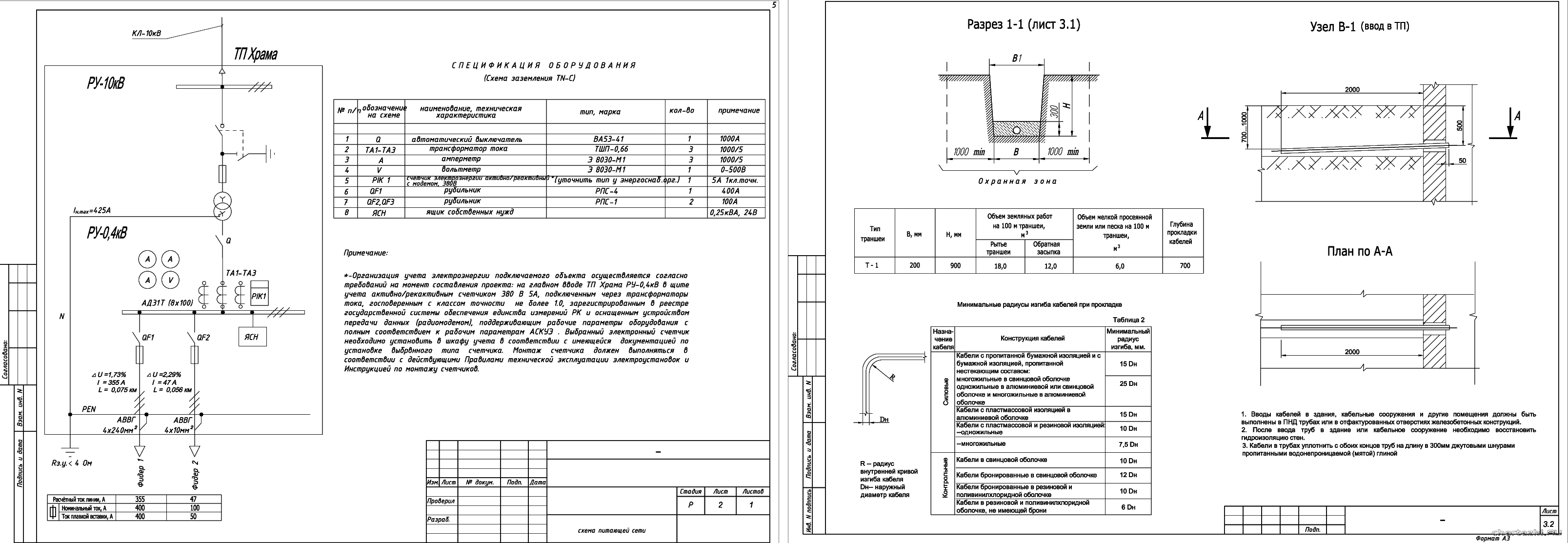 Р / Внешнее электроснабжение объекта - монтаж КЛ-0,4кВ с расчетами выбора сечения кабеля; организация учета электроэнергии; выбор отключающих устройств. / Состав: комплект чертежей + спецификация.