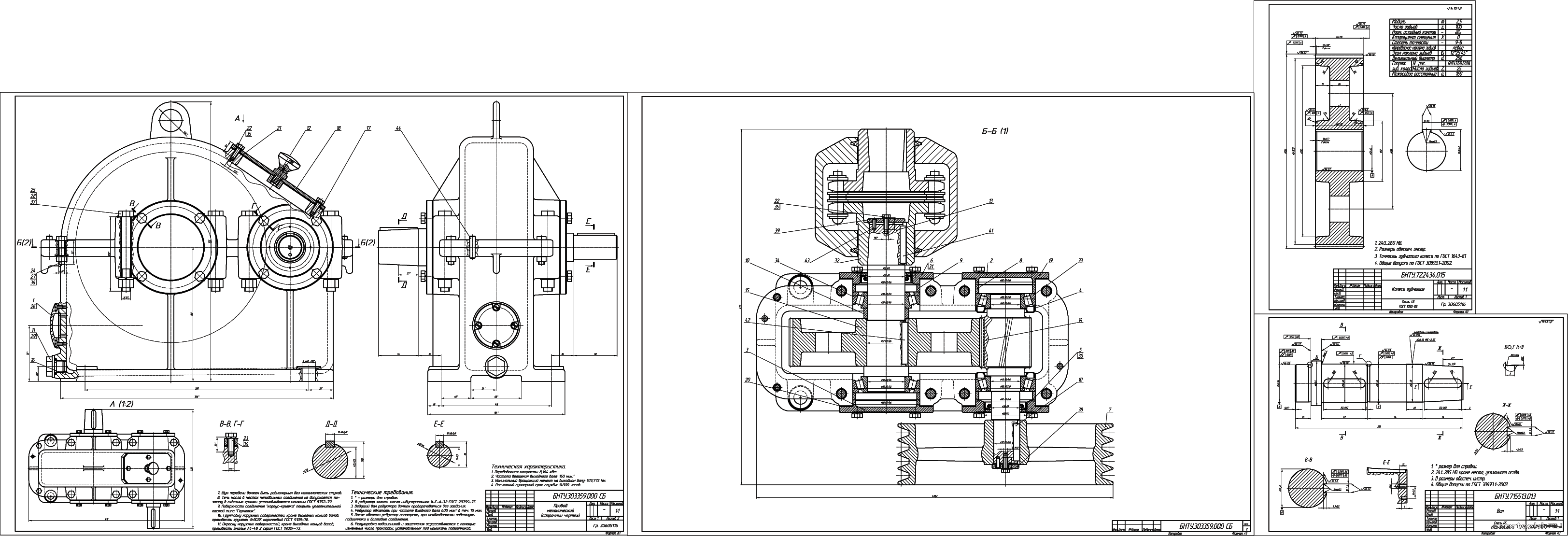 БНТУ / Кафедра машиноведение и детали машин / по дисциплине "Детали машин" / Задачей курсового проекта является: разработать привод ленточного конвейера. Привод состоит из электродвигателя, конической открытой передачи, двухступенчатого цилиндрического развернутого редуктора, кулачково-дисковой муфты и вала рабочего органа. Назначение привода: передача крутящего момента от вала электродвигателя к валу рабочего органа. / Состав: 3 листа чертежи (свертка, развертка, общий вид) + спецификация + ПЗ (78 страниц).