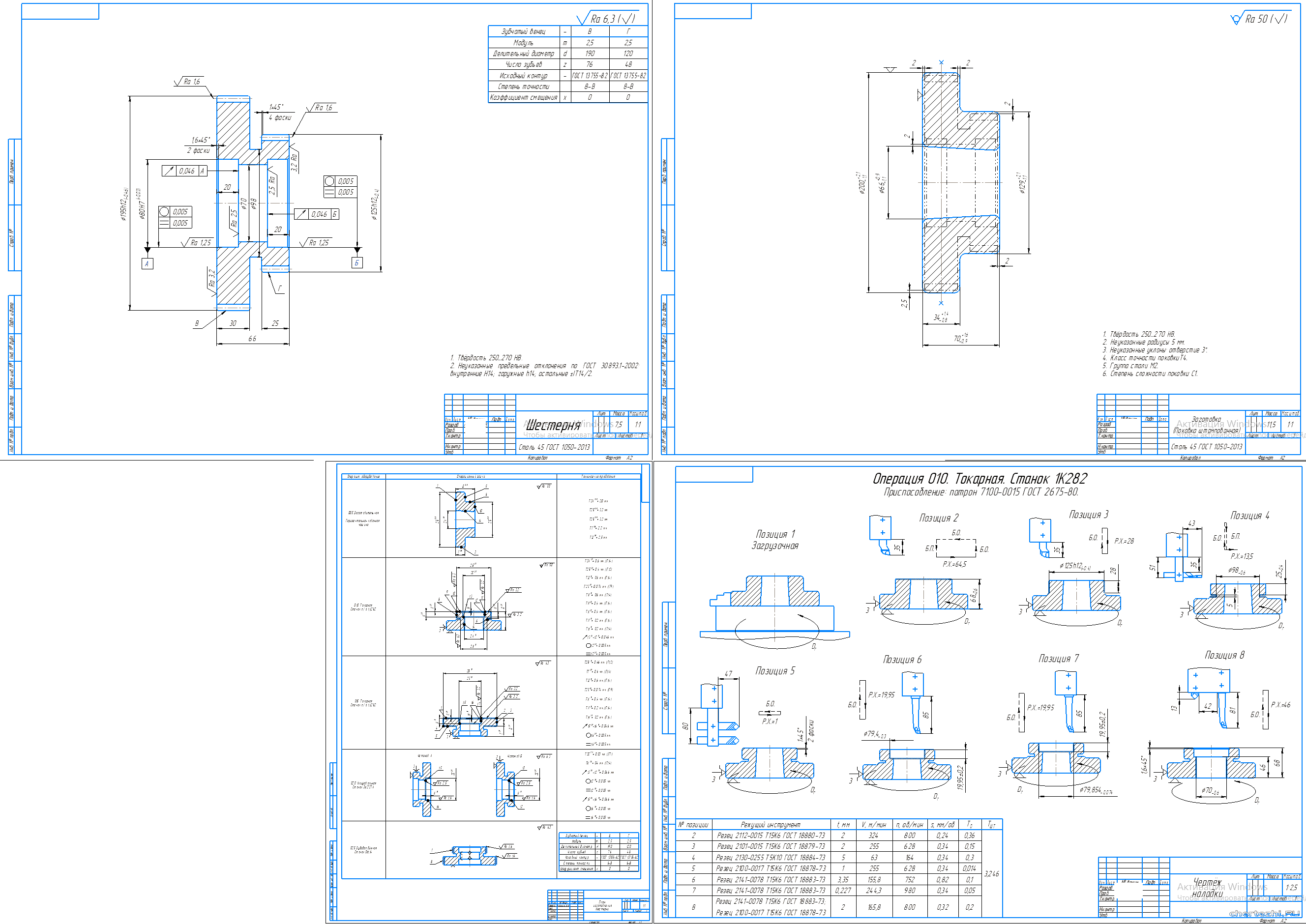 ТГУ / Кафедра «Оборудование и технологии машиностроительного производства» / Росдистант / Анализ конструкции детали; проектирование заготовки; разработка маршрутного тех. процесса с выбором оборудования, приспособлений, инструментов; подробная разработка одной операции 010. Токарная с расчётом режимов резания и нормированием; оформление тех. документации по результатам работы: маршрутный тех. процесс, карты эскизов и операционные карты на операцию 010. / Состав: 4 листа чертежи (деталь "шестерня", заготовка, план обработки детали, наладка на операцию 010.Токарная) + ПЗ (44 страницы).