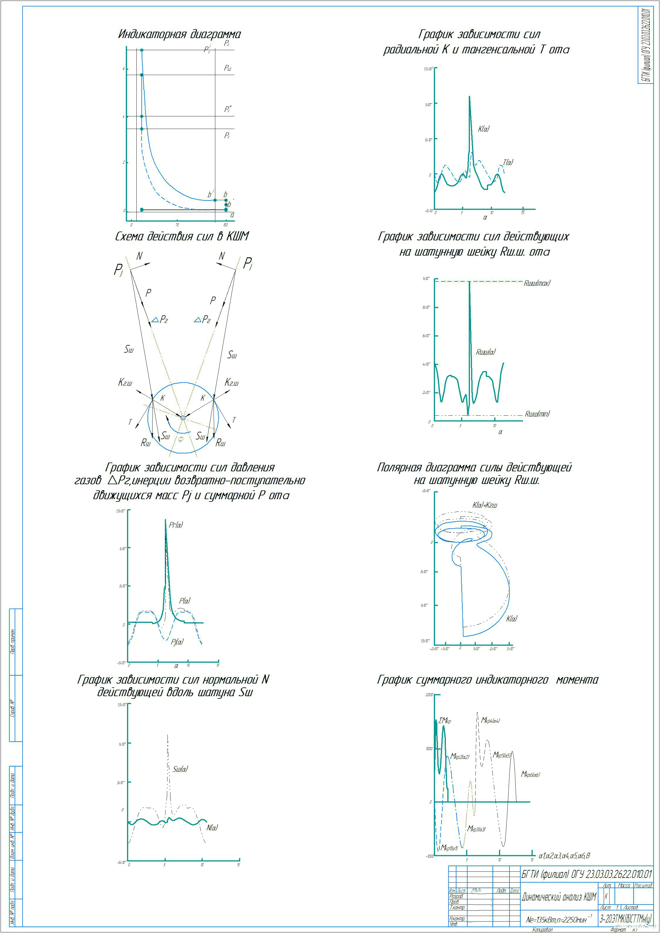 БГТИ(ф)ОГУ / Кафедра общепрофессиональных и технических дисциплин / по "Рабочим процессам, конструкции и основам расчета энергетических установок и транспортно-технологического оборудования" / Получить навыки и знания в области теории двигателей внутреннего сгорания. Тепловой расчет рабочего цикла; расчет внешней скоростной характеристики; динамический расчет кривошипно-шатунного механизма. / Состав: 1 лист чертеж (индикаторная диаграмма, диаграмма по результатам динамического расчета, схема действия сил в КШМ) + ПЗ (58 страниц).