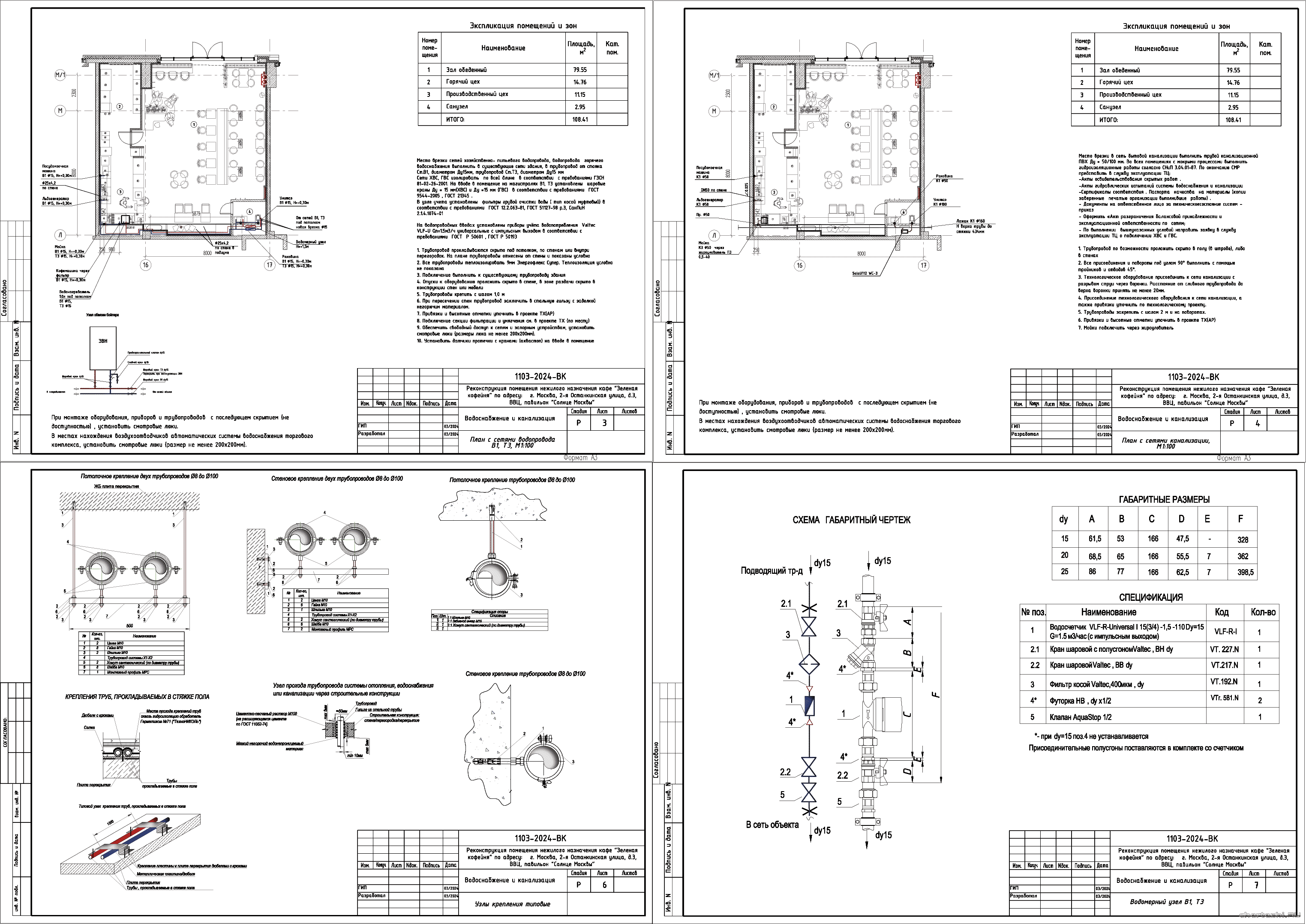 Коротко о файле:Р / Данным проектом предусматривается устройство систем водоснабжения и канализации кафе в спортивно-гостиничном комплексе. / Состав: комплект чертежей + спецификация.