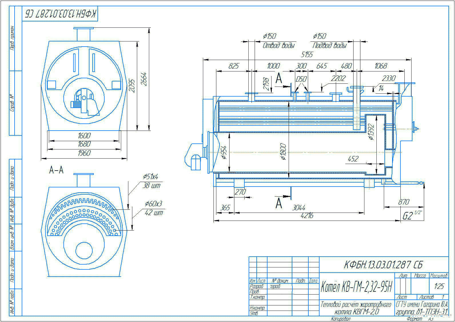 СГТУ / Цель работы — провести теплотехнический и конструктивный расчёт водогрейного котельного агрегата, работающего на природном газе, оценить параметры продуктов сгорания, рассчитать тепловые потери, определить тепловой баланс и конструктивные размеры топочных элементов. / Состав: 1 лист чертеж + ПЗ (34 страницы).