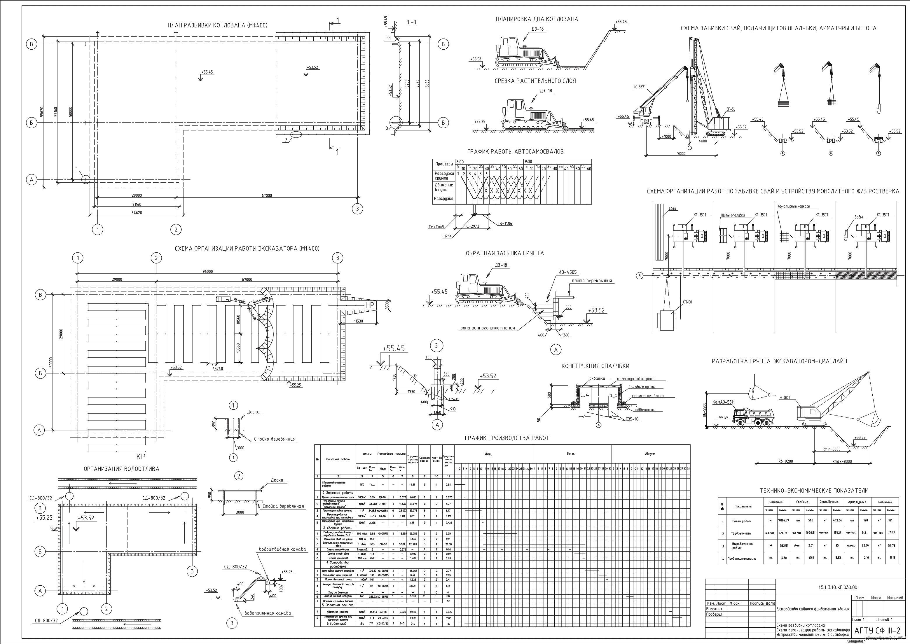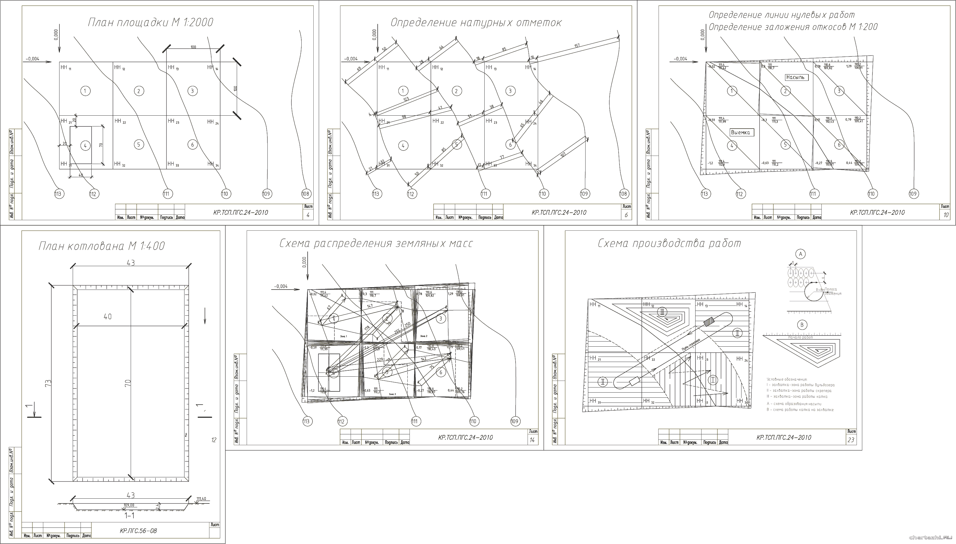 Определение натурных, проектных и рабочих отметок. Определение линии нулевых работ. Подсчет объемов выемки и насыпи. Составление технологических схем. Нормирование труда и зарплаты. Календарный график. / Состав: 1 лист чертеж + ПЗ.