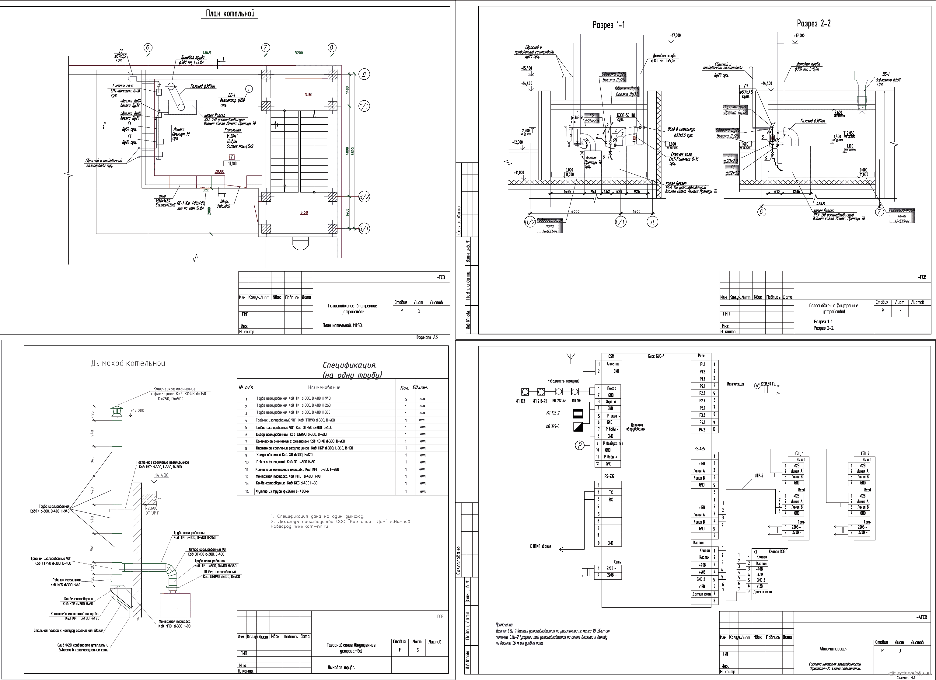 | П / Проектной документацией предусматривается демонтаж 2-х существующих котлов КЧМ-5-ГВ мощностью по 96 кВт, установка двух проектируемых котлов мощностью по 96 кВт каждый производства ROSSEN г. Туймазы. Разделом "Автоматика безопасности" предусматривается замена действующей автоматики безопасности котельной САКЗ-МК-3 на новую автоматику САКЗ-МК-3 с выводом сигналов об аварийном состоянии на пульт в помещение охраны и предусматривает автоматику безопасности и управление газовых котлов, пожарную и охранную сигнализацию, а так же автоматический контроль загазованности в помещении котельной с выводом сигнализации в помещение охраны. / Состав: 2 комплекта чертежей + спецификации + ПЗ.