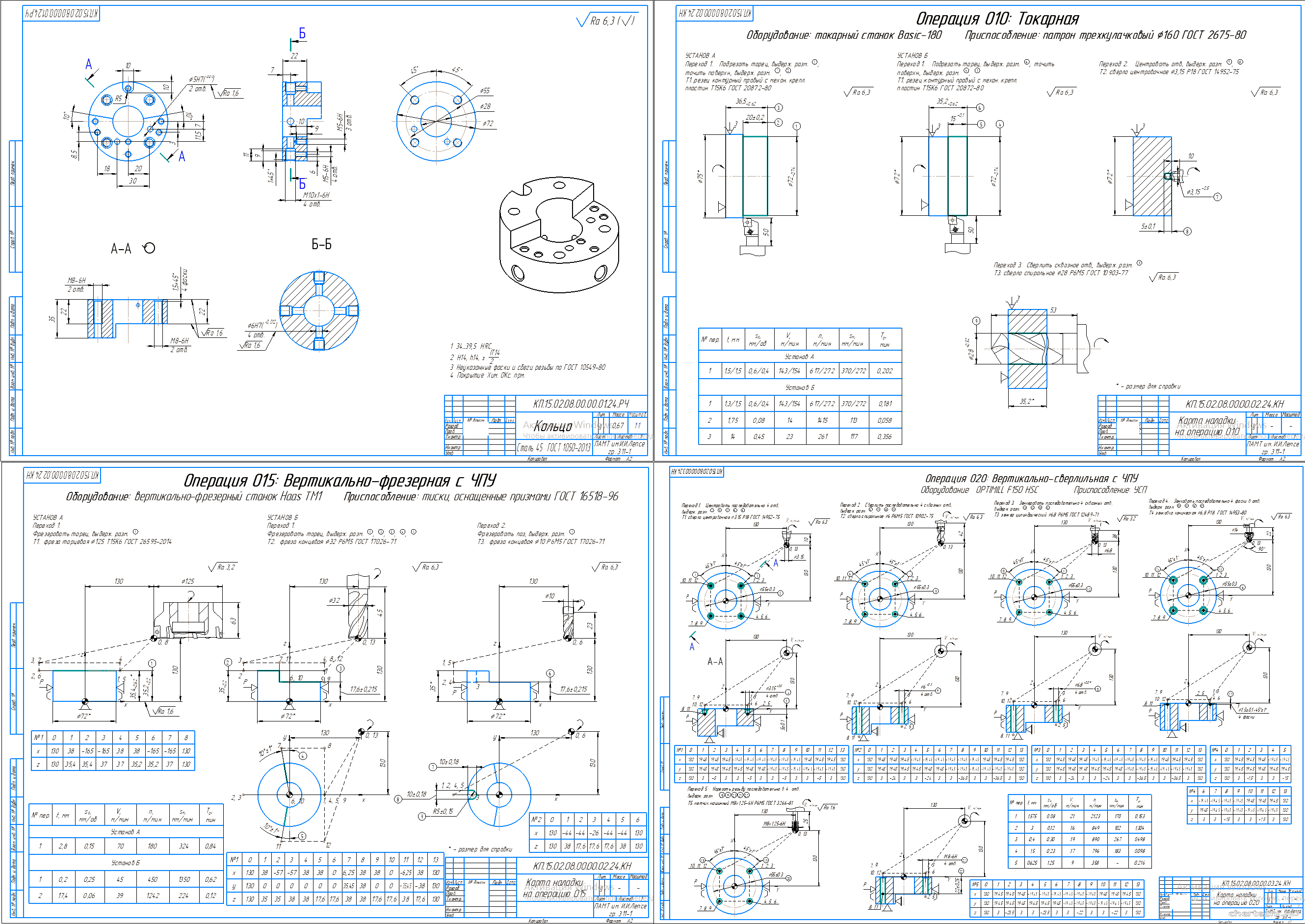 ПАМТ им. И.И. Лепсе / по дисциплине "Технология машиностроения" / Разработка технологического процесса для изготовления деталей методом механической обработки / Состав: 4 листа чертежи (кольцо, карты наладки на операции) + комплект тех. документации + ПЗ (53 страницы).