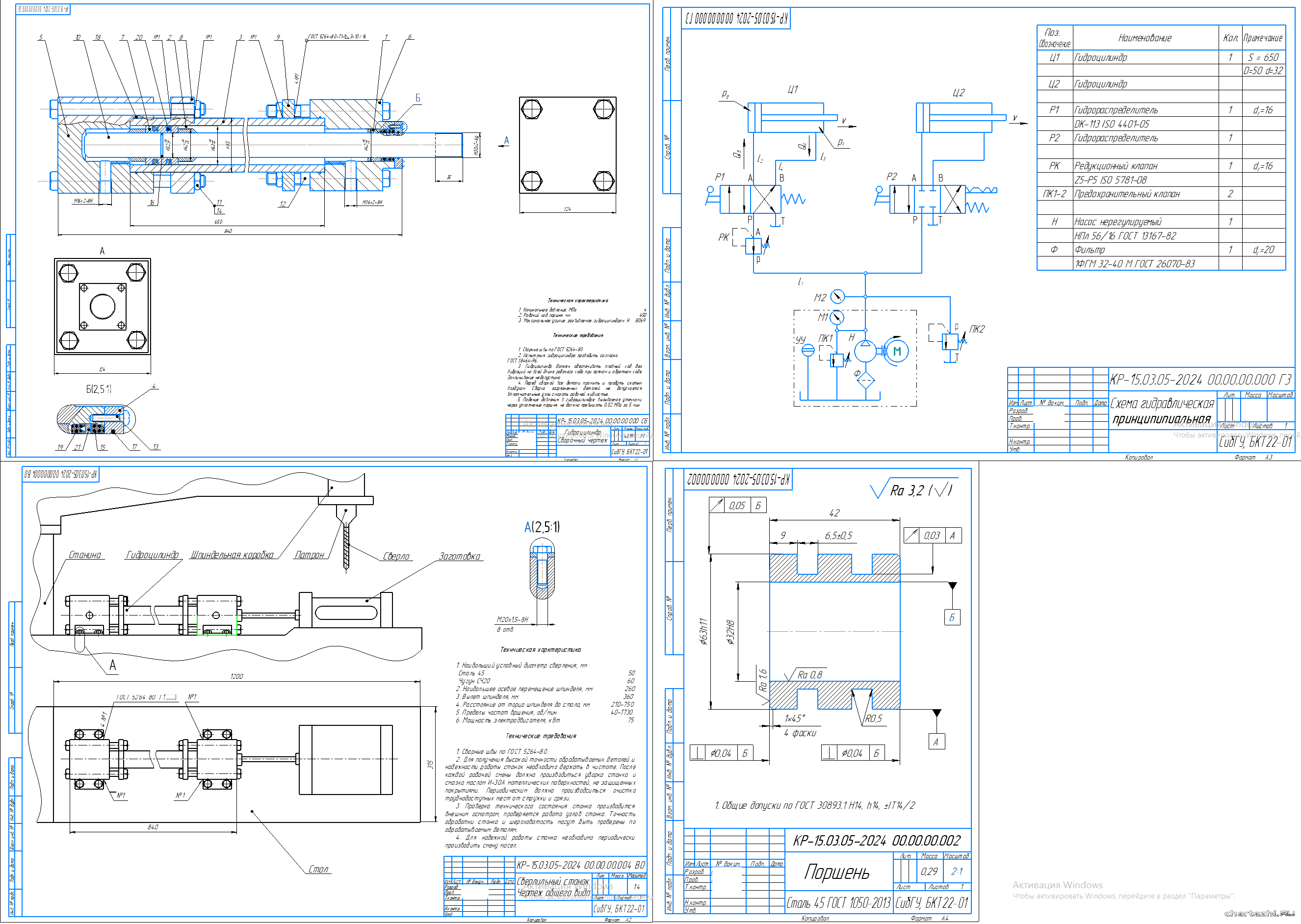 СибГУ им. М. Ф. Решетнёва / Кафедра технологии машиностроения / Определение параметров гидропривода сверлильного станка путем проведения силового, энергетического, гидравлического, и теплового расчетов для обеспечения надежности и эффективности работы гидросистемы. / Состав: 4 листа чертежи (Гидроцилиндр (СБ) А1, чертеж типовой детали - Поршень А4, Принципиальная схема гидравлическая А3, Чертеж общего вида А2) + спецификация + ПЗ (20 страниц).
