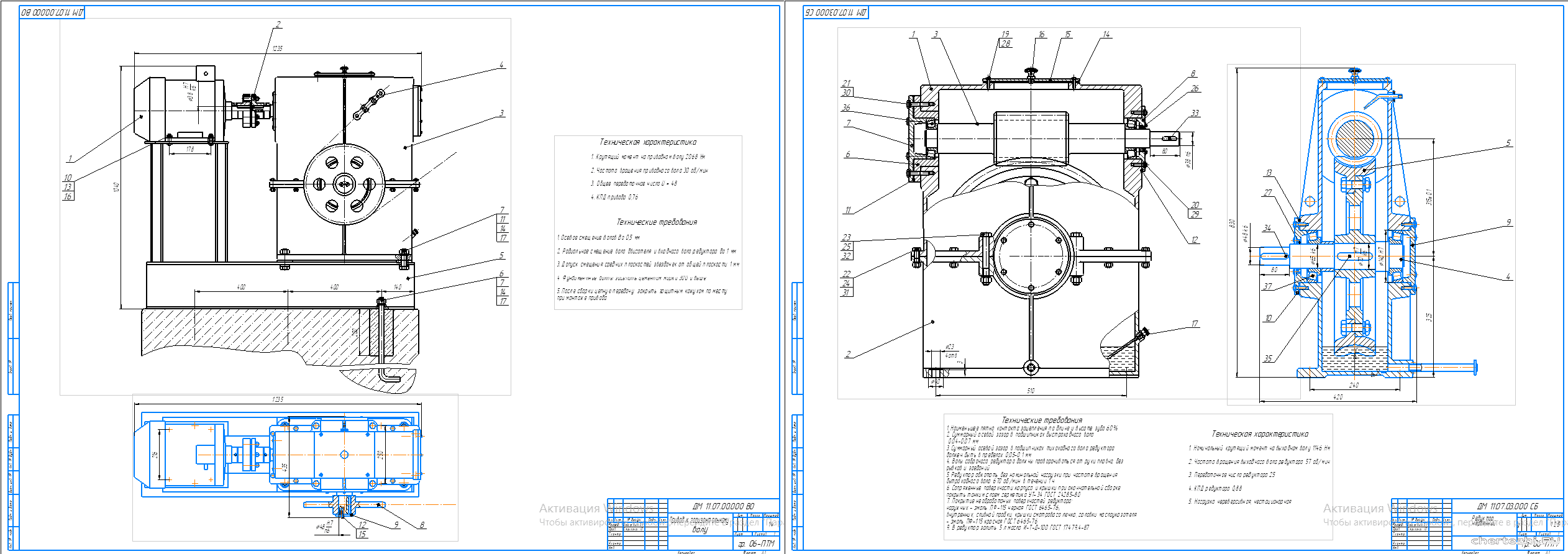 Все чертежа выполнены на листах различных форматов, чаще на стандартном листе А1 и содержат обычно две проекции редуктора с указанием параметров работы механизма, его габаритов и отклонений. Все размеры, обозначенные на чертеже, соответствуют ГОСТ 2.307-68.