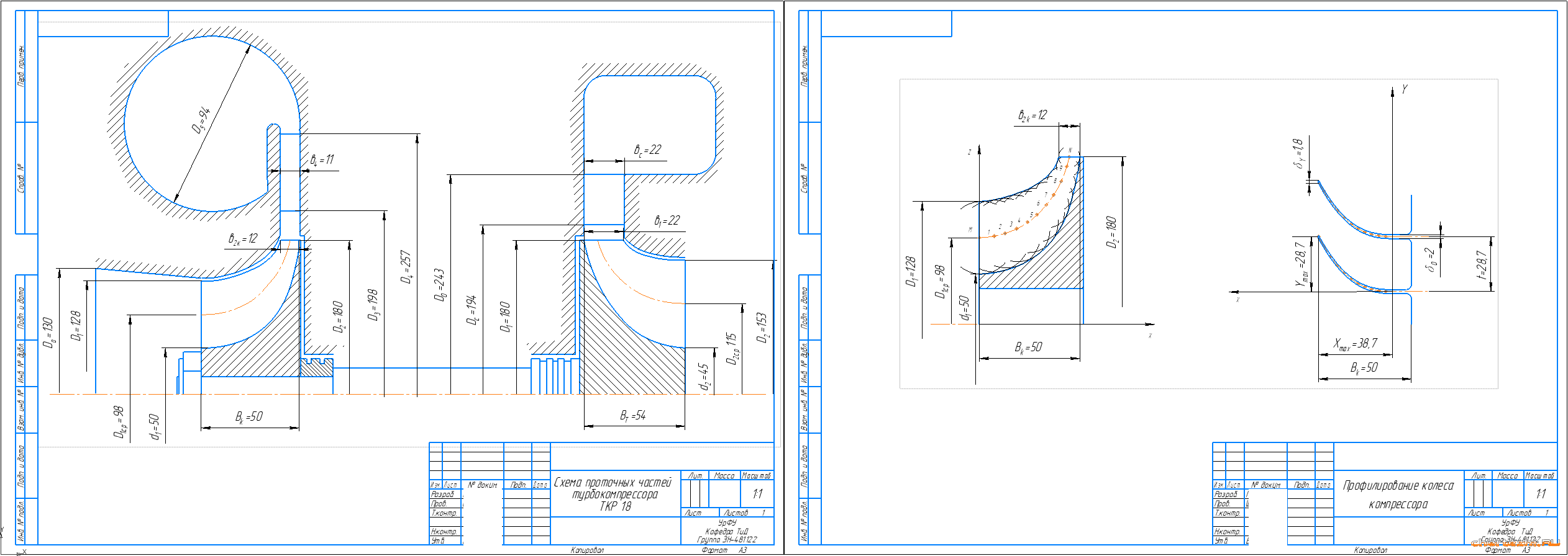 КФ МГТУ им.Н.Э.Баумана / Разработана конструкция ГТУ. Увеличен КПД газотурбинной установки по сравнению с прототипом за счёт увеличения температуры перед турбиной газогенератора. Произведён расчёт осевого компрессора, кольцевой прямоточной камеры сгорания, двухступенчатой турбины газогенератора, двухступенчатой силовой турбины для привода нагнетателя природного газа; произведён расчёт на прочность диска второй ступени турбины газогенератора. Разработаны наладки на токарную операцию диска второй ступени компрессорной турбины и на сверлильную операцию отверстий под призонные болты; разработано приспособление для серления радиальных отверстий. / Состав: 10 листов чертежей (нагнетатель, схема пневматическая, технологическая схема компрессорного цеха, ГТУ, деталировка) + ПЗ