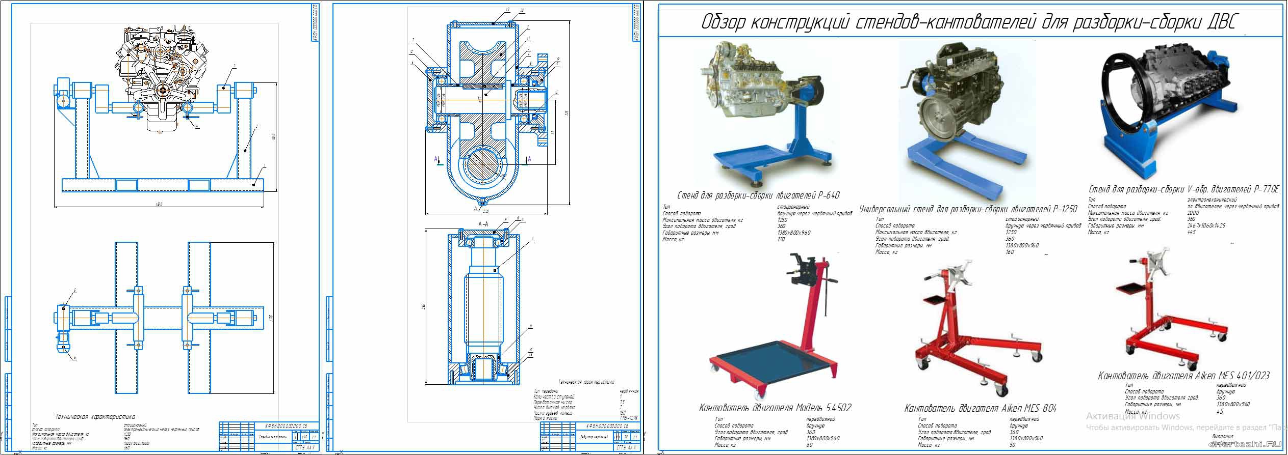 Стенд для ремонта и диагностики автомобильных систем представляет собой специальный механизм, позволяющий удобно вывешивать устройства и узлы машины, подключать необходимое диагностическое оборудование и производить работы по поиску и устранению неисправностей. Чертёж стенда двигателя разрабатывается с учётом типа автотранспортных средств, для которых он предназначен и имеющегося дополнительного оборудования, используемого в ремонтных работах. Стенд должен предусматривать возможность вывешивать двигатель и транспортировать его по помещению. Чертежи стендов для ремонта двигателя учитывают такие требования к данному оборудованию, как наличие механизма, позволяющего изменять угол закреплённого двигателя в пределах 0-360 градусов. Примерная конструкция такого оборудования может содержать: