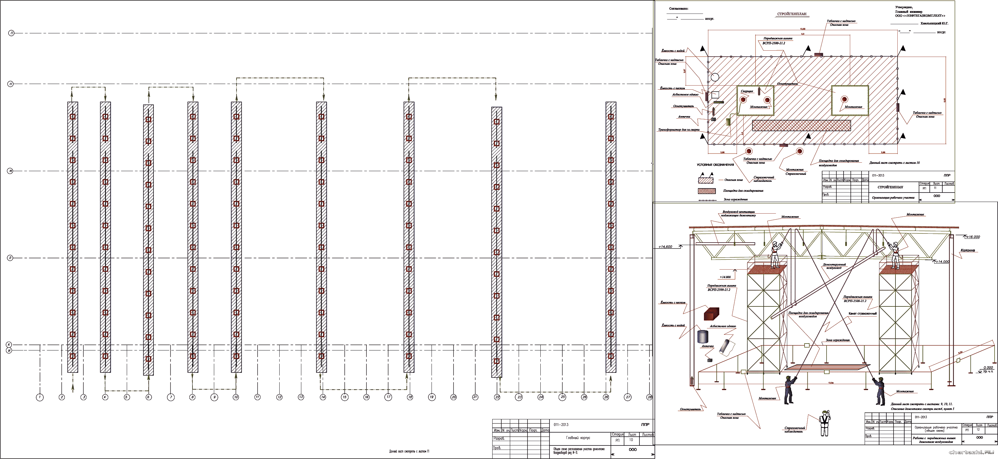 - генеральный план объекта с размещением временных сооружений бытового характера, временных линий водоснабжения, электропитания, канализации, зон складирования, строповок, линий движения транспорта, кранов и пр.);