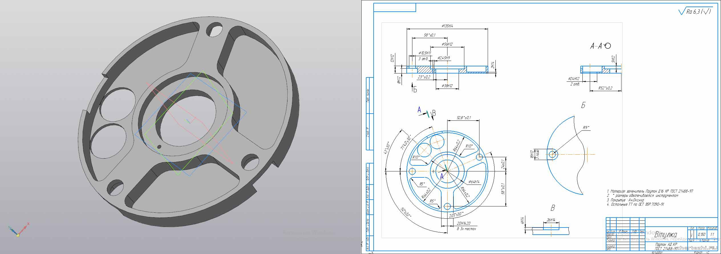 ИжГТУ / Кафедра ТММСиИ / Втулка — деталь машины, механизма, прибора цилиндрической или конической формы (с осевой симметрией), имеющая осевое отверстие, в которое входит сопрягаемая деталь. В данной работе мною была выбрана втулка токосъемника высокой частоты. Деталь «Втулка» представляет собой тело вращения состоящая из посадочного отверстия Ø 40H7, конического отверстия с проточками и каналами для смазки, торцевых и цилиндрических поверхностей к которым предъявляются требования по биению и цилиндричности. Для данной втулки был выбран титановый деформируемый сплав ВТ6. / 14 листов чертежи + маршрутные карты + наладка + операционные карты + спецификация + ПЗ.