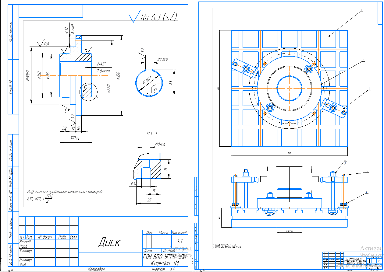 УГТУ-УПИ / Кафедра ЭМ / по технологии машиностроения. Деталь - Диск. / Состав 2 листа чертежи (деталь и приспособление) + спецификация + технологические карты 8 листов + ПЗ.