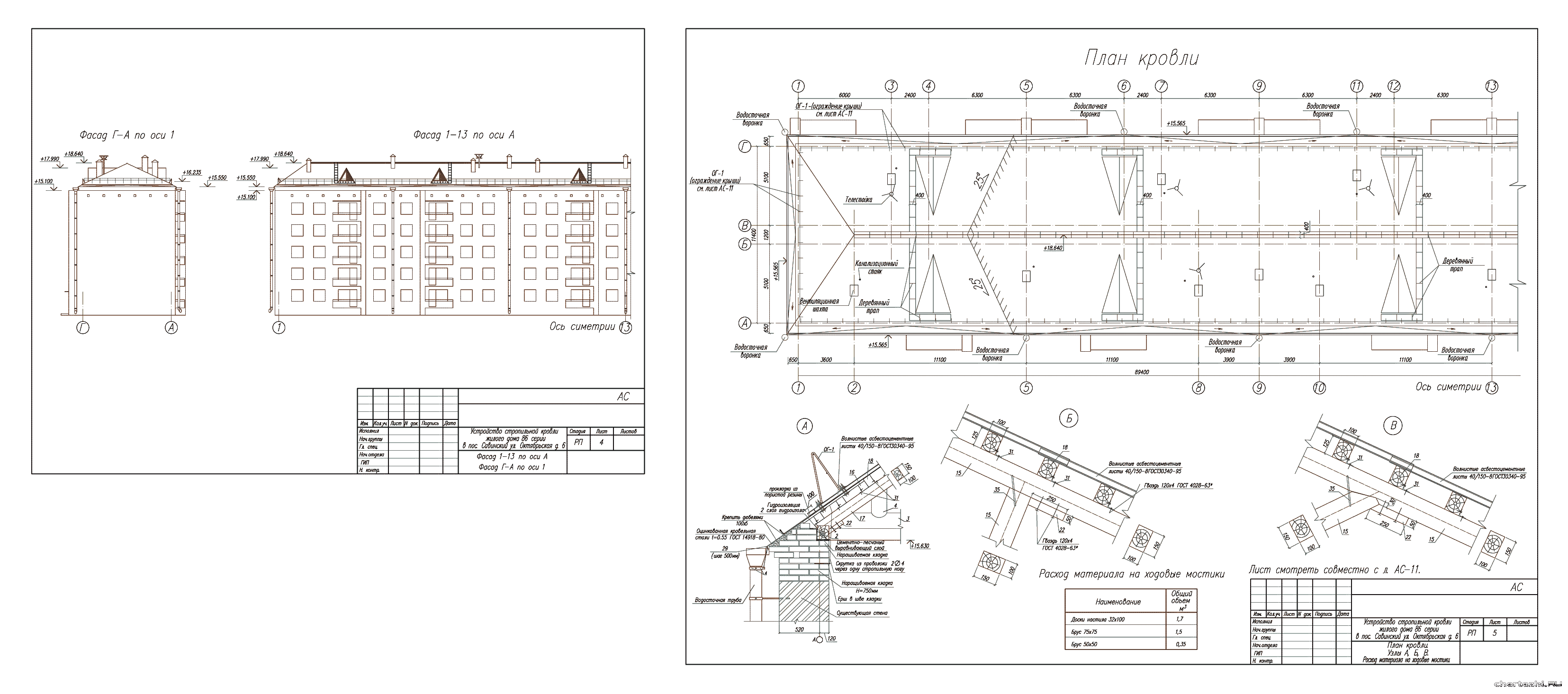 При выполнение проекта основным пожелание заказчика было просторное помещение 3-го этажа, дом из бруса. В проекте 4 листа чертежи: Разрез, Схема расположения элементов крыши, План кровли. Узел А, Конструкция кровли. Спецификация элементов.