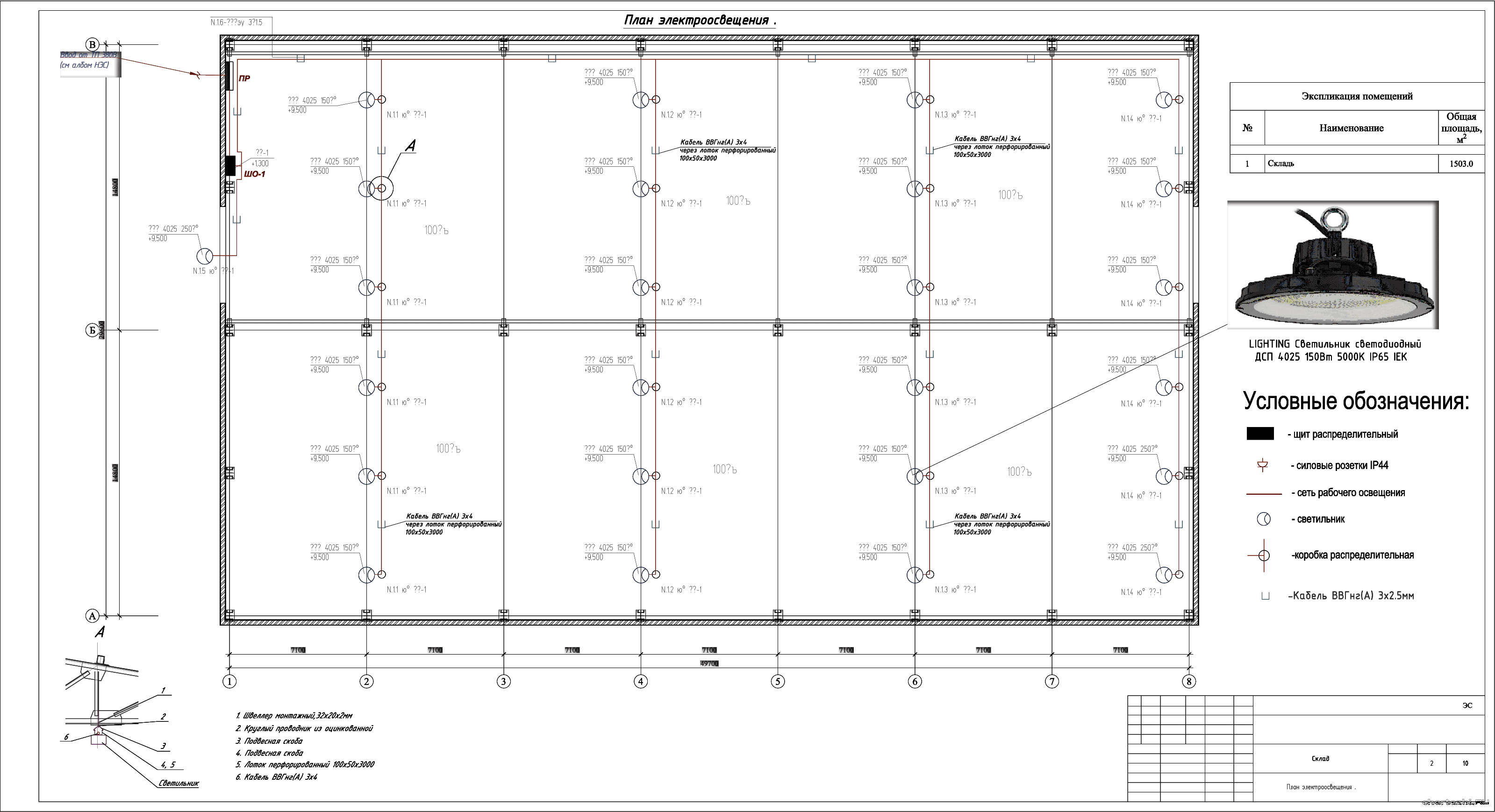 Коротко о файле:Электроосвещение склада. / Состав: комплект чертежей + спецификация.