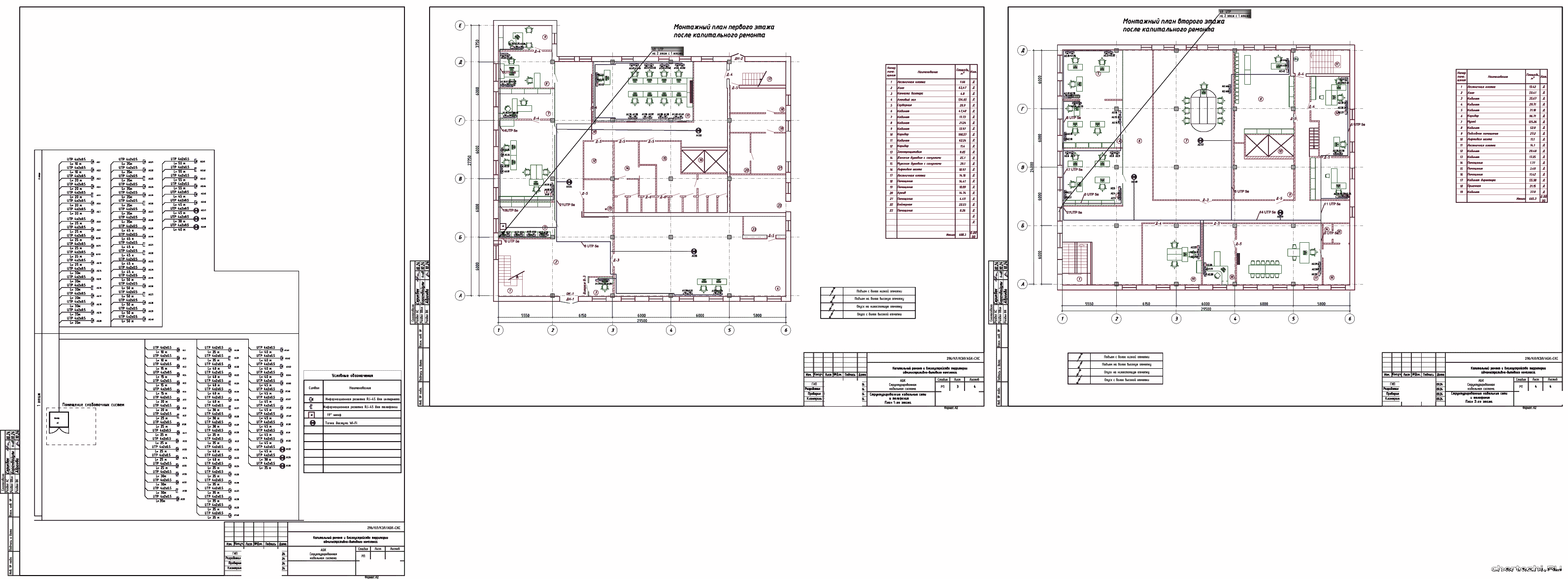 Стадия Р / В данном офисе реализована СКС на основе патч-панелей и розеток Netgear. Подключение принтеров и розеток для точек Wi-Fi осуществляется по кабелям категории Cat 5e. Подключение телевизоров и проекторов осуществляется по кабелям категории Cat 6. Для подключения Проекторов к ПК предусмотрена установка розеток HDMI в напольных и Кабели LAN и Wi-Fi сведены на патч-панели RJ45 в шкафу в кроссовой. / Состав: комплект чертежей + Кабельный журнал + Спецификация